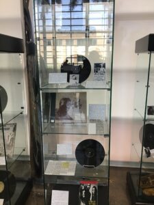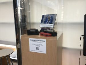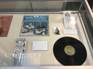 Below you will find photographs of the actual exhibit that was put on display from 2019-2020 Celebrating Black Blues Artists. This exhibit featured unique items from the collection showcasing Black Blues musicians, along with a touch and listen portion on an oversized monitor highlighting different musicians highlighted in the cases alongside their recordings creating an interactive portion to the exhibit itself.